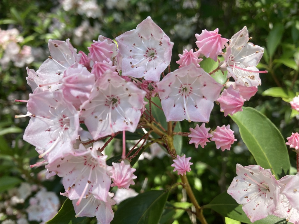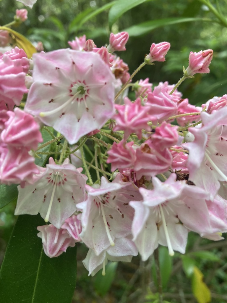 On a recent vacation I just happened to be on the trails at the exact right time to find mountain laurels in full bloom. Though I hike a lot, I often find myself in mountain laurel areas thinking to myself “I have to remember to come back here when these will be in full bloom.” And then not getting back to them until the same time the next year, if at all. So I was thrilled to find myself in multiple places with these beauties in full show.