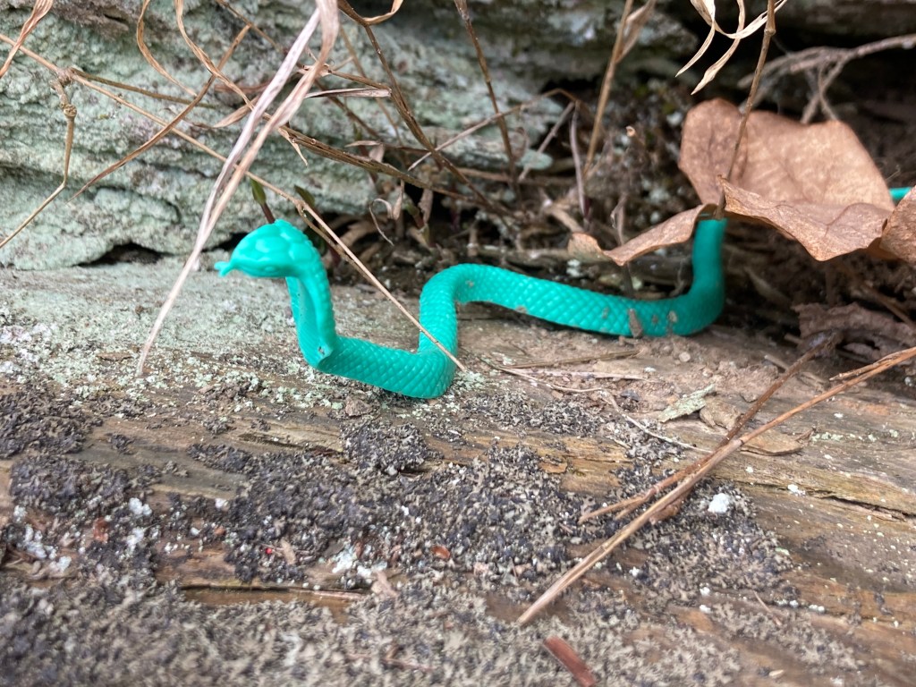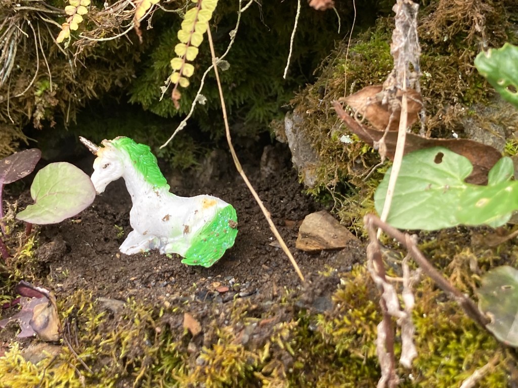 On this day I also noticed some one had tucked little non-natural treasures into the tapestry of moss, roots and leaves. I found a tiny duck, a little bunny, a unicorn and a turquoise snake.
