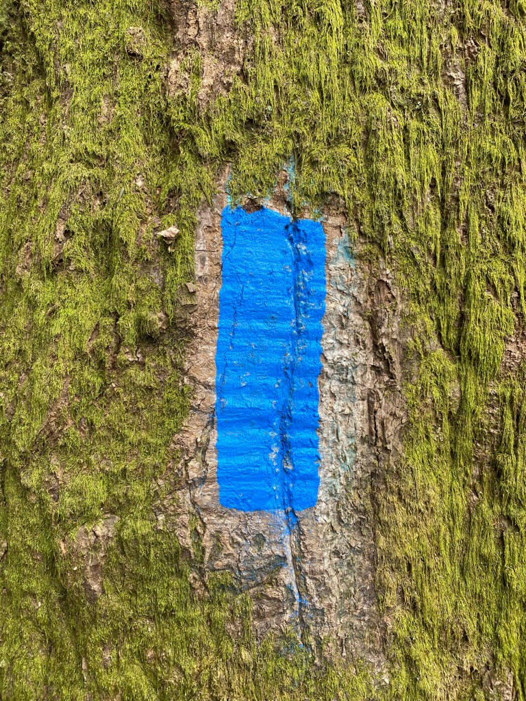 A blue trail blaze within a. coating of moss on a tree marks the way. Susquenhannock State Park, PA