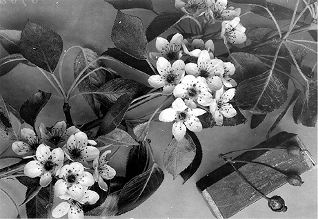 Pyrus calleryana, natural size. A somewhat small-flowering type of a wild Calleryana pear, with rather tomentose foliage, which isn’t full grown yet. Three fruits of last year’s crop has persisted on the tree during the whole winter and spring. Note the very small size, on which account the Chinese call it the “T’ang li” or crab-apple pear, as these small fruits, with deciduous calyx, resemble the tiny apples of Malus spectabilis and M. baccata to a surprising degree. (Meyer.)