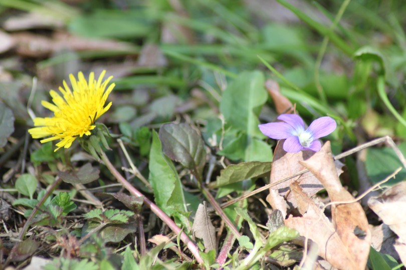 Violet competing with other naturalized plants. May 6, 2014 4752 × 3168 Violets Violet holds its own with the mighty dandelion. Violets bloom at the same time as these familiar lawn invaders. (c) Kathleen V Salisbury