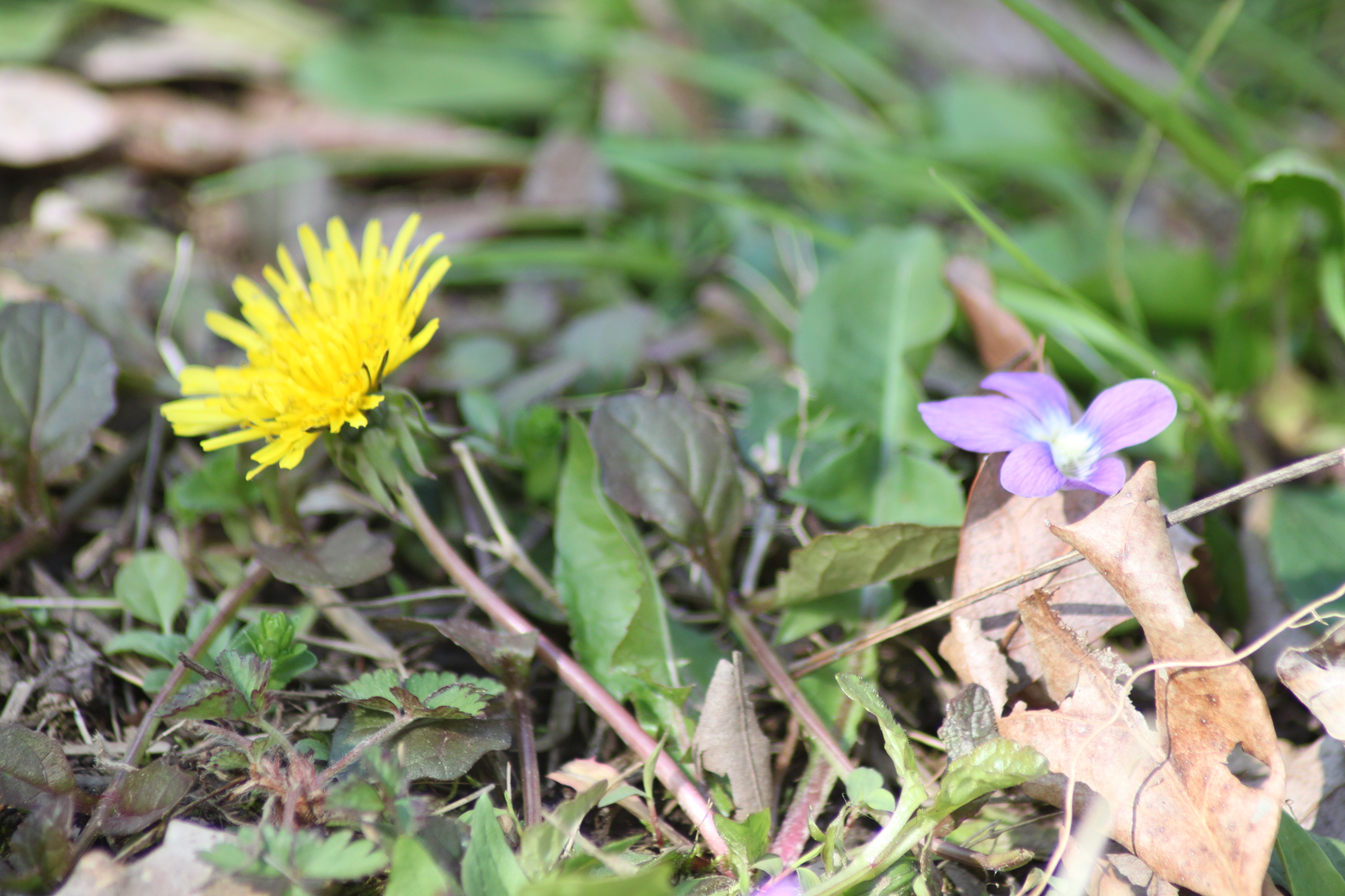 Violet holds its own with the mighty dandelion. Violets bloom at the same time as these familiar lawn invaders.