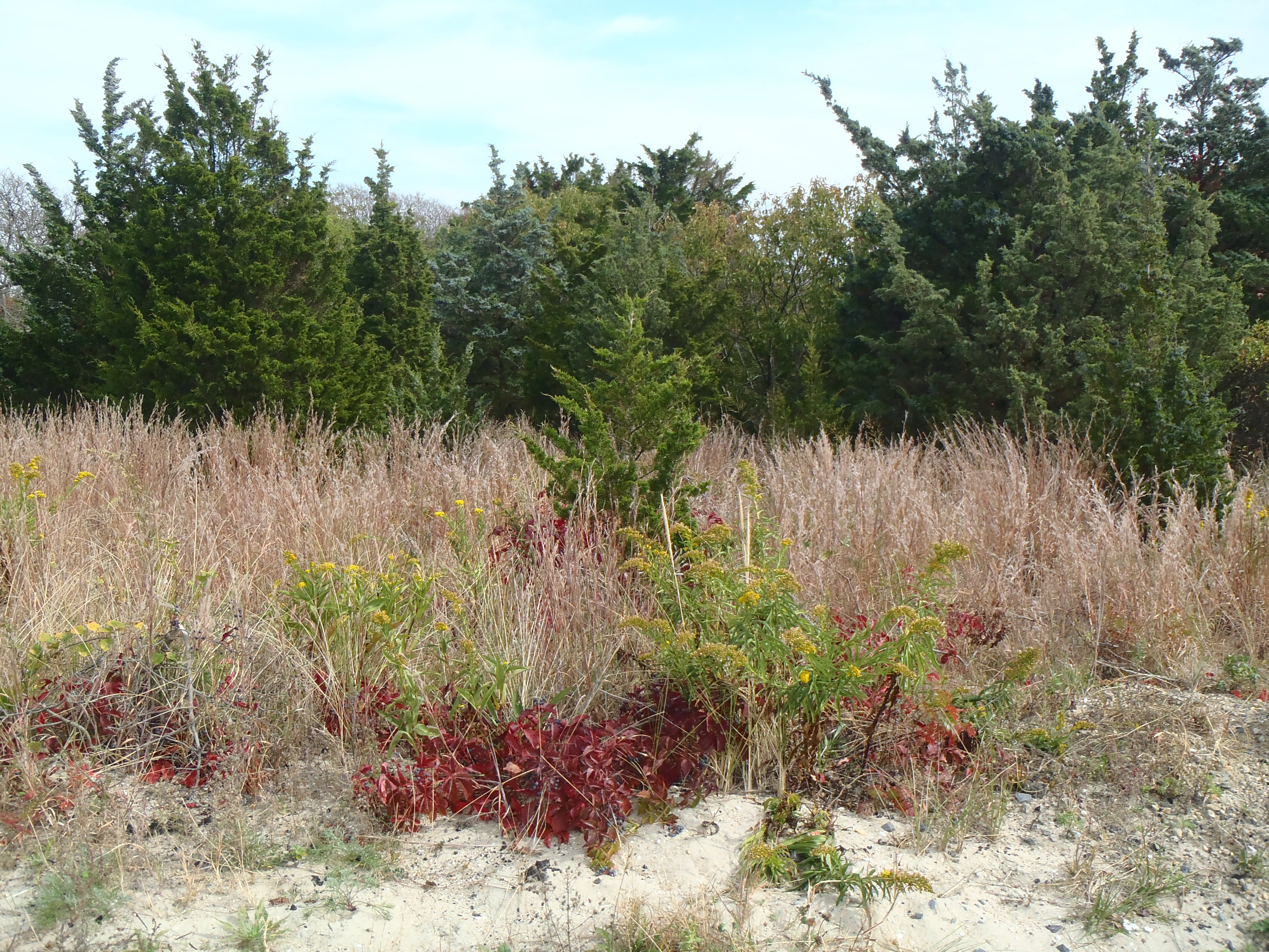 Sandy Hook Solidago September 19, 2014 4288 × 3216 Goldenrod Seaside Goldenrod (Solidago sempervirens) in the Outer Coastal Plain Plant Community at Sandy Hook National Park, NJ Notice the Bright Red fall color of Virginia creeper and the blue foliage of Red Cedar. (c) Kathleen V Salisbury