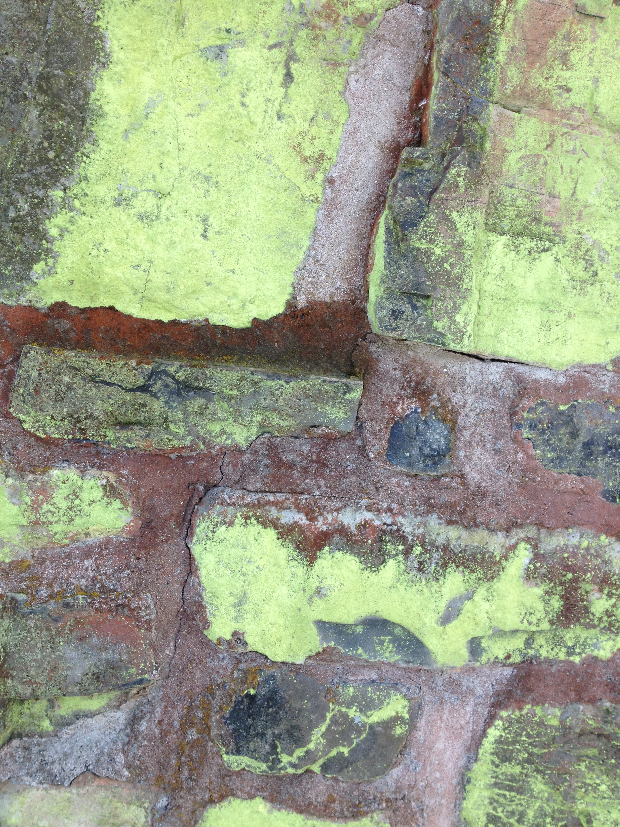 Lime Green Lichen on the stone foundation of a historic home March 29, 2015 2448 × 3264 A Unique Relationship This foundation dates back to the early 1700s and these bright green lichen have taken a liking to it. (c) Kathleen V Salisbury & HORTravels.com 2015