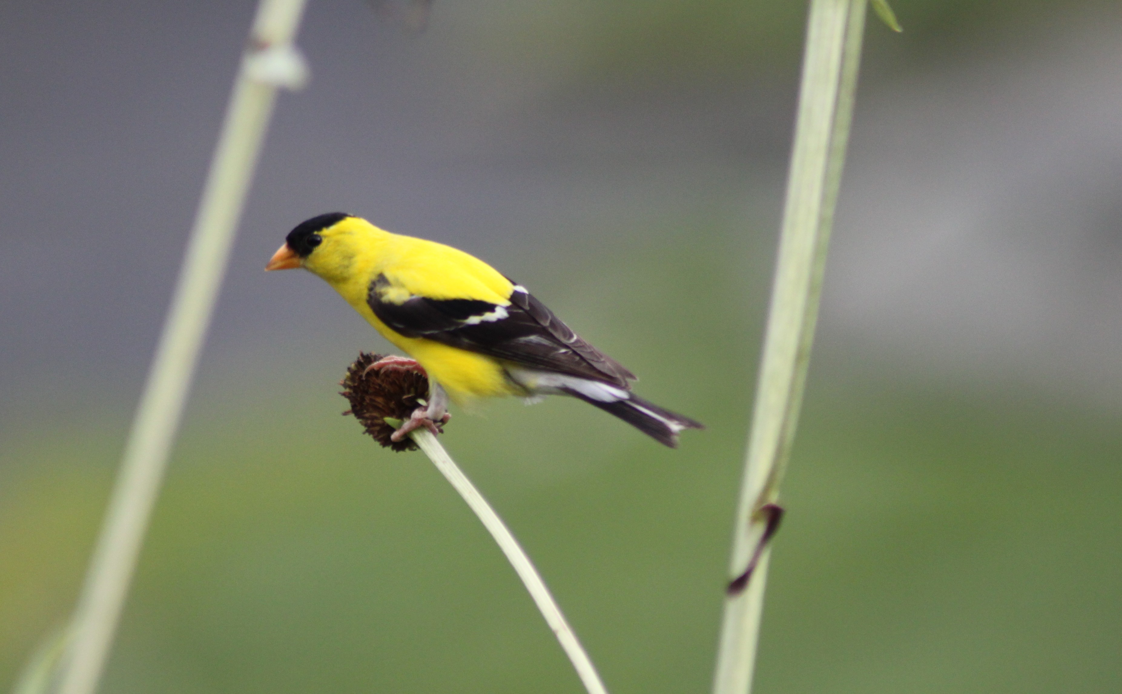Goldfinch May 6, 2015 3706 × 2292 Caterpillary If only I had a picture of a goldfinch with a catkin in its mouth…no such luck. Here’s one perched atop a Great Coneflower (Rudbeckia maxima) Seedhead. Private Landscape NE NJ (c) Kathleen V Salisbury & HORTravels.com 2015