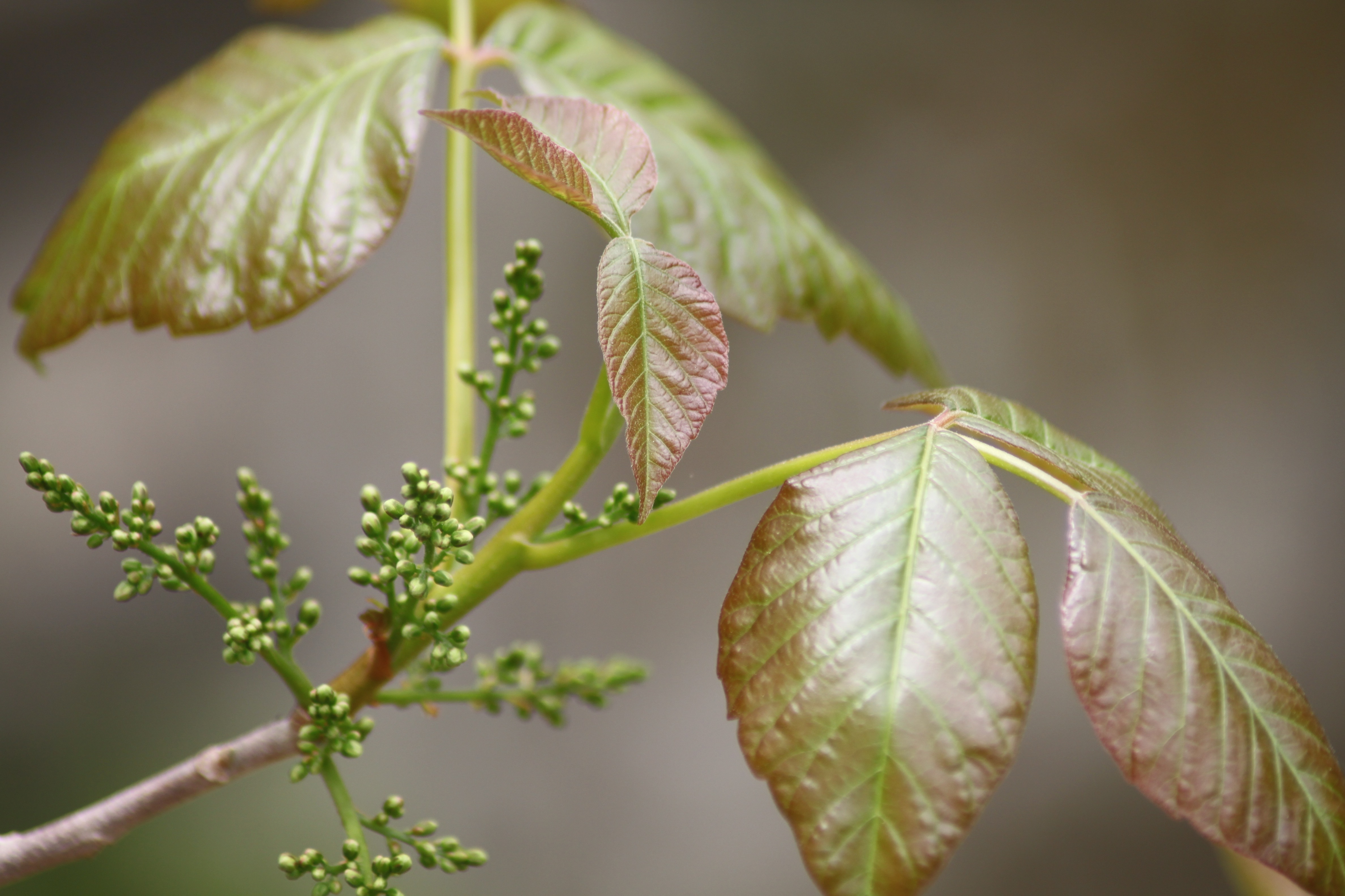 Emerging Poison Ivy January 30, 2016 4752 × 3168 Defense The flower buds and shiny leaves of poison ivy disguise the potential rash to come. photo by Kathleen V Salisbury (c) Kathleen V Salisbury & HORTravels.com