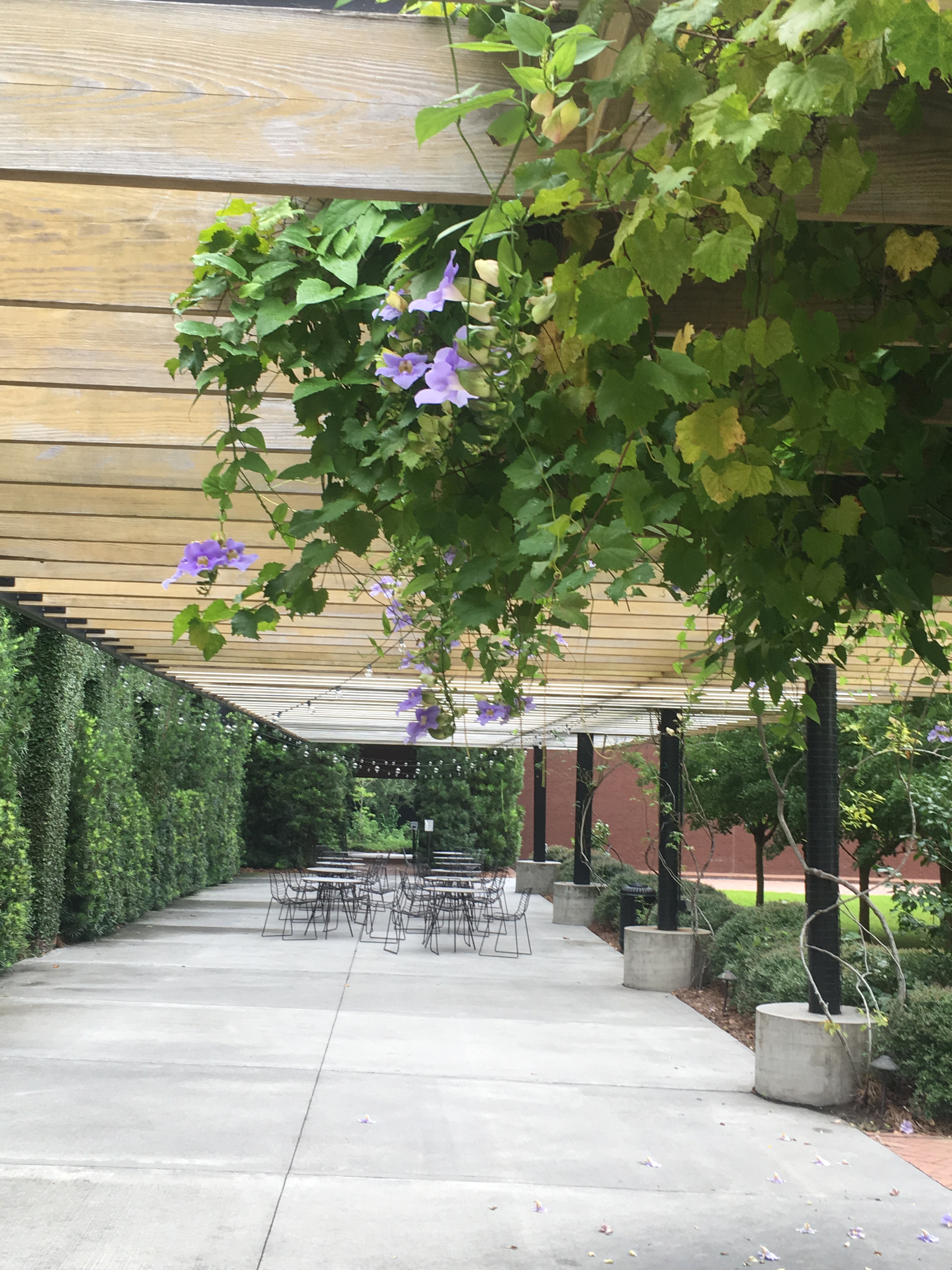 IMG_8872 November 1, 2019 1920 × 2560 The William Scarbrough House and Gardens at the Ships of the Sea Maritime Museum, Savannah GA The long trellis of Thunbergia grandiflora, Blue Sky Vine