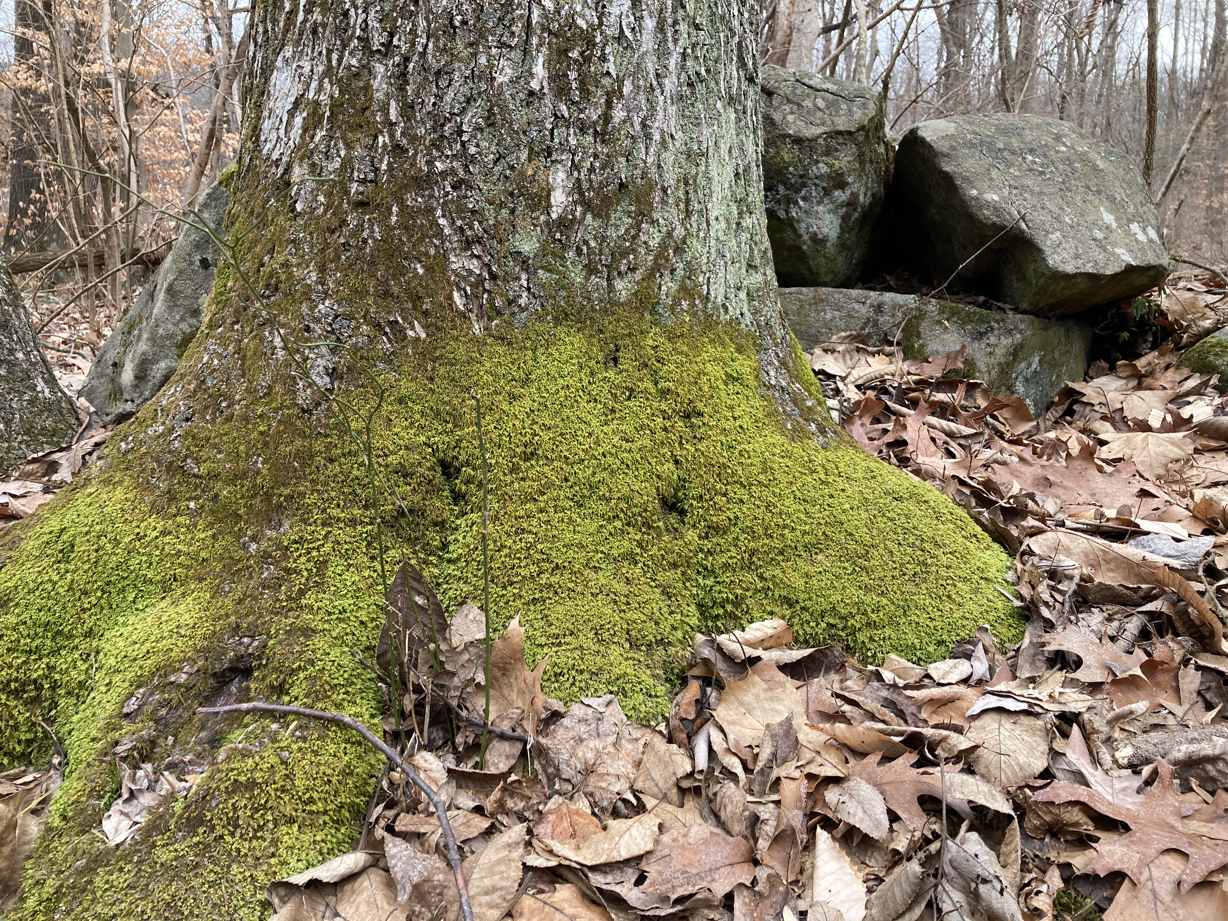 A blue trail blaze within a. coating of moss on a tree marks the way. Susquenhannock State Park, PA