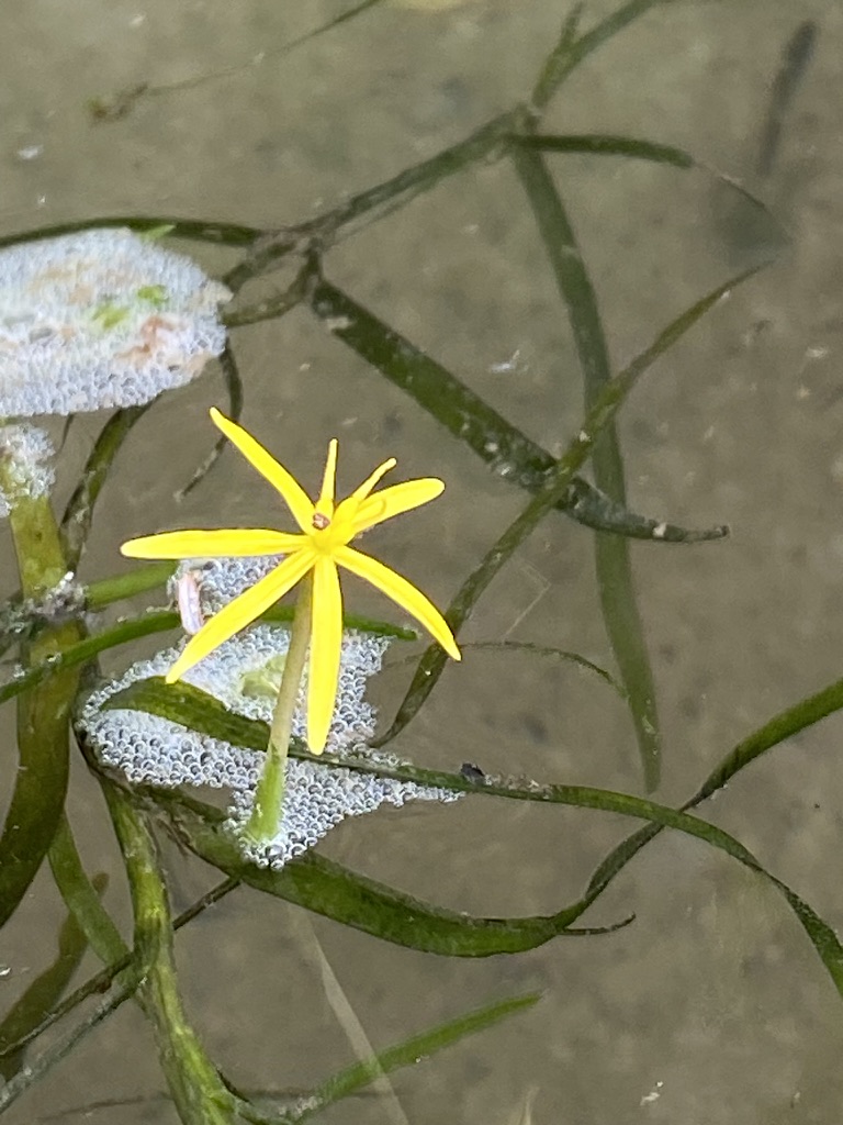 Water Star-grass (Heterenthera dubia). This plant will have these yellow flowers when closer to shore in shallow waters. In deeper water, they do not get these showy flowers but rather have cleistogamous (self-pollinating apetalous flowers) at the base of the leaves (Common Violets also get these types of flowers).